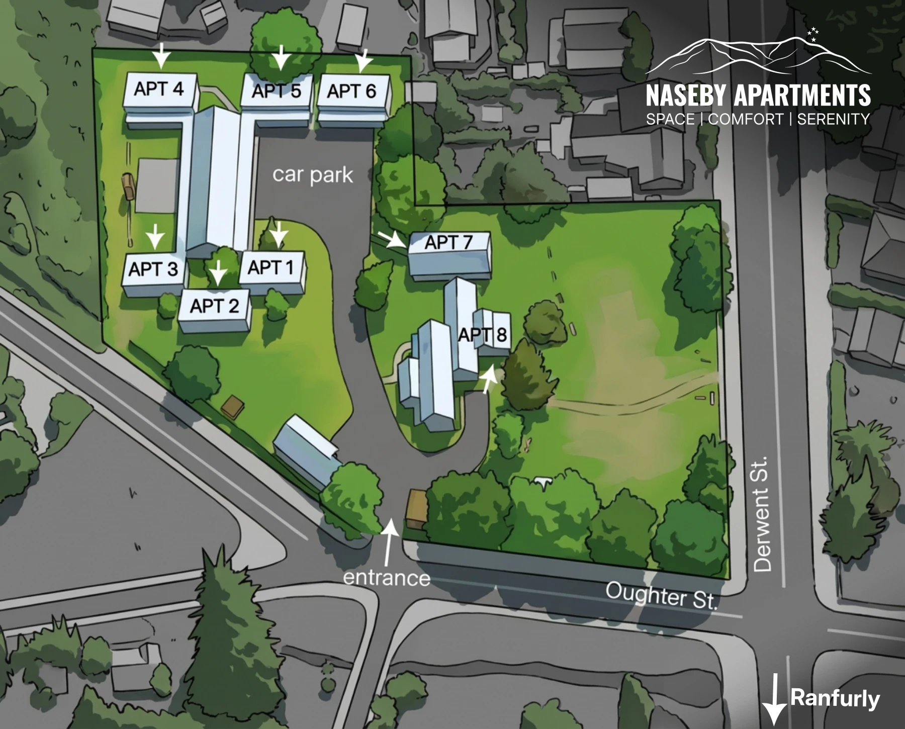 - For navigation, search for "Naseby Apartments" or use the street address above. Look for the sign at the corner of Derwent and Oughter Streets.